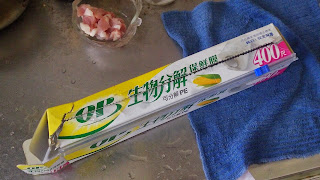 結果保鮮膜還沒用完,保鮮膜附刀的紙盒就先爛掉了。 (遠目